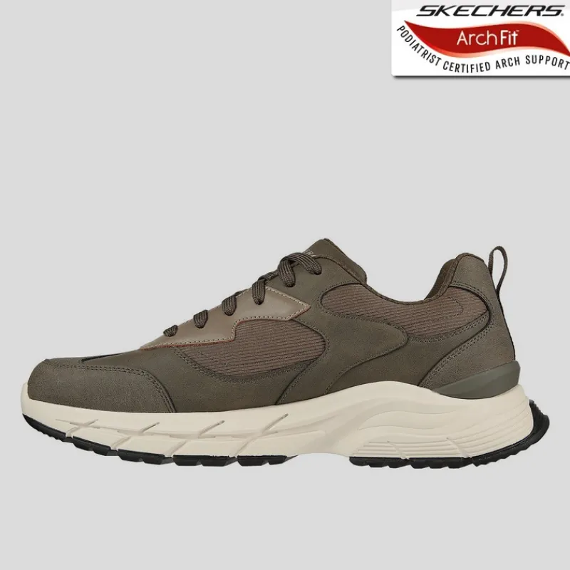 Zapato Deportivo de Hombre SKECHERS ARCH FIT BAXTER DWYER color VERDE OLIVA. Parte superior de piel y malla con cordones y plantilla extraíble Arch Fit® con soporte para el arco plantar certificado por podólogos. Suela de caucho Goodyear con tracción.