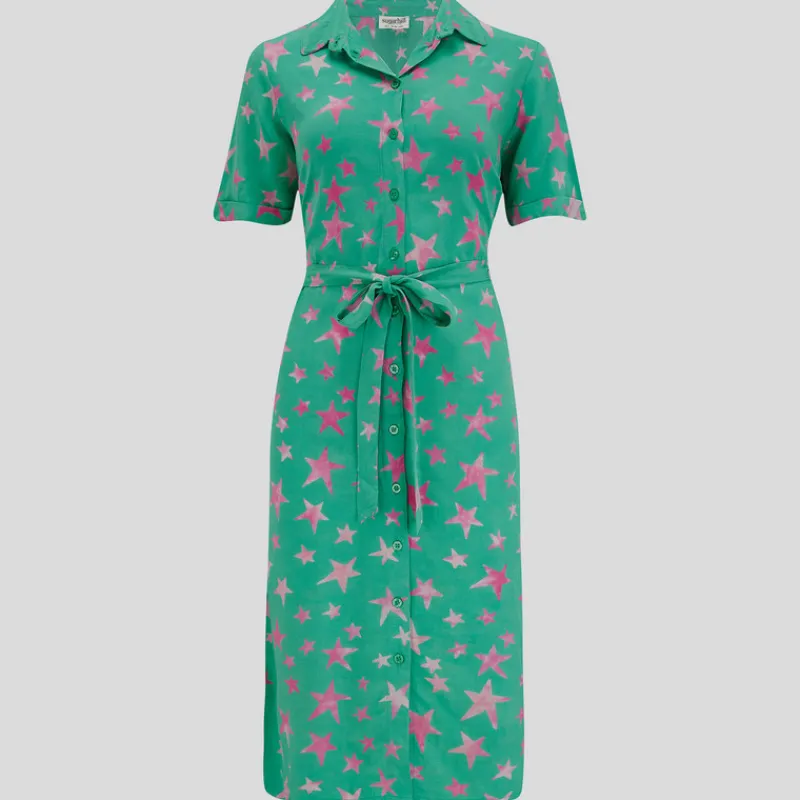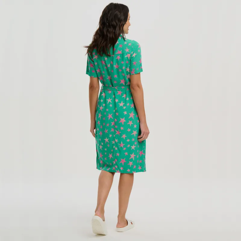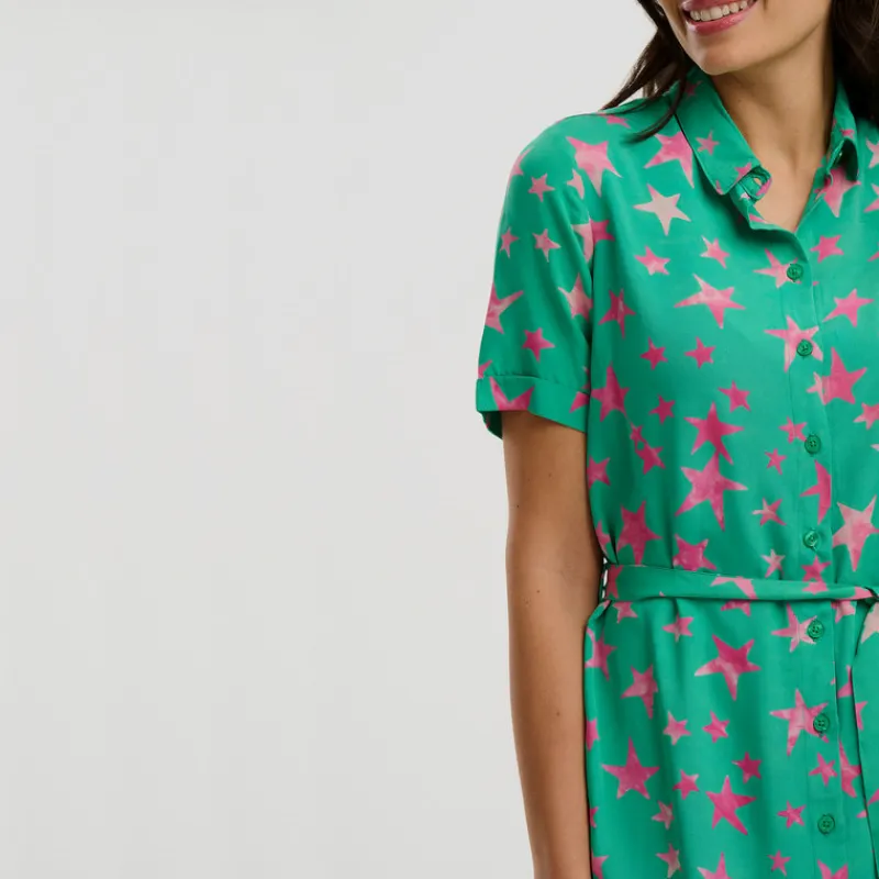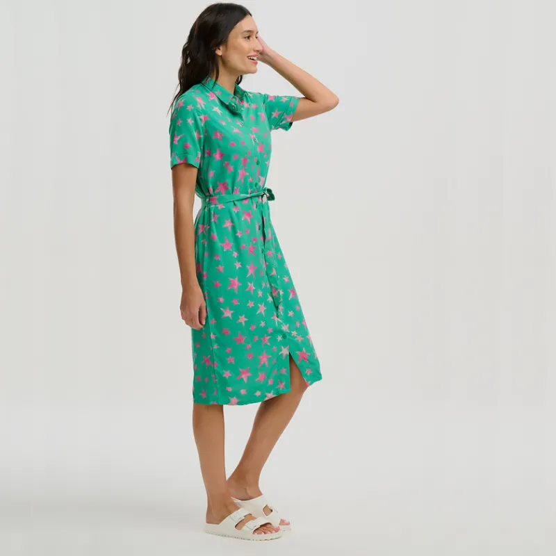 Vestido Camisero Midi SUGARHILL modelo JANICE confeccionado en Viscosa color VERDE con ESTAMPADO ARTESANAL «BATIK» resistente a la cera con motivos «Supernova Stars» ROSA. Cuello camisero, manga corta, cierre frontal por botones con cinturón de lazo.