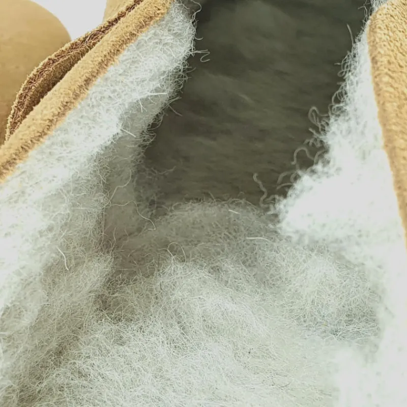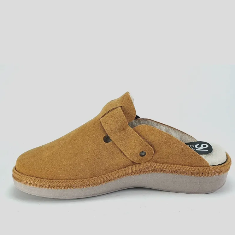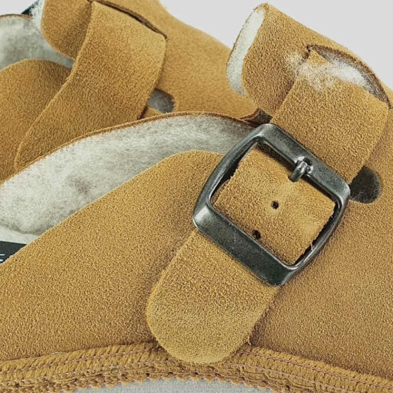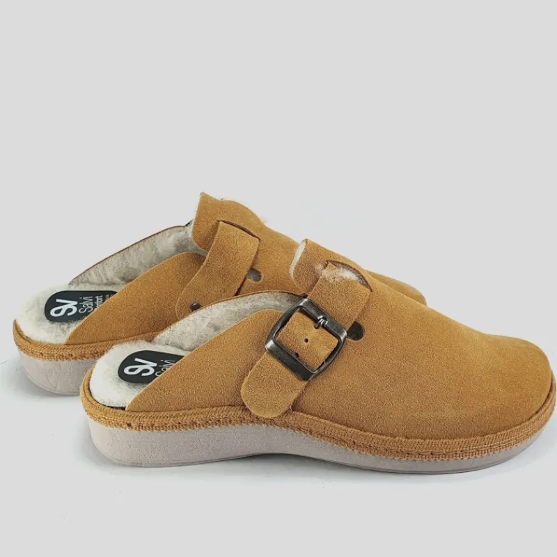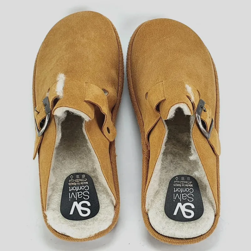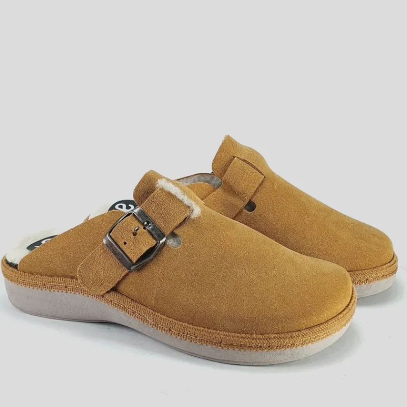 Zapatilla Abierta de casa confeccionada exteriormente en SERRAJE color CUERO y forrada interiormente en PURA LANA VIRGEN color BEIGE. Modelo estilo zueco con ajuste por TIRA CON HEBILLA. Plantilla interior acolchada en lana. Suela de goma en cuña flexible