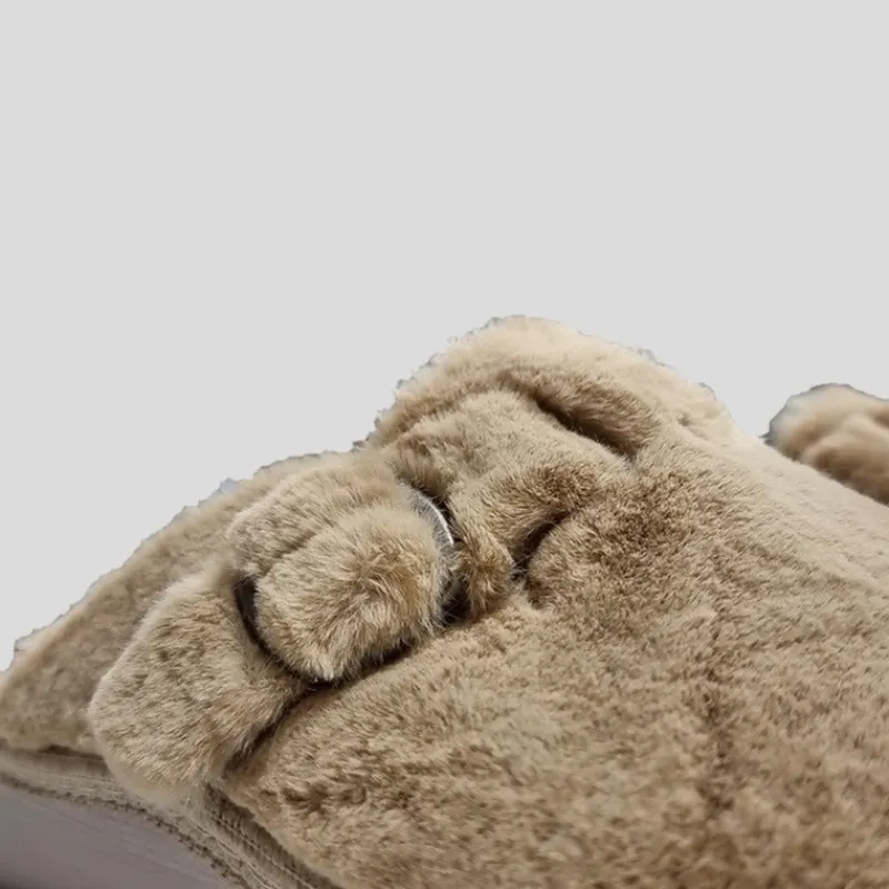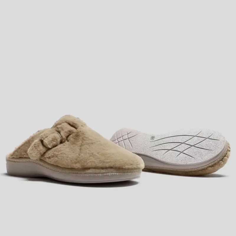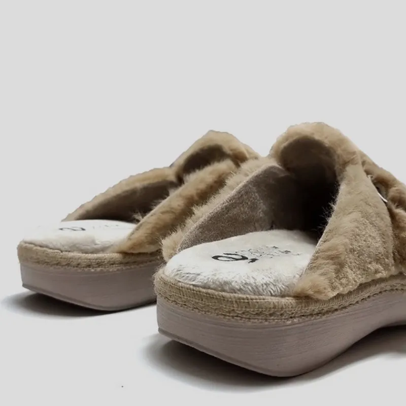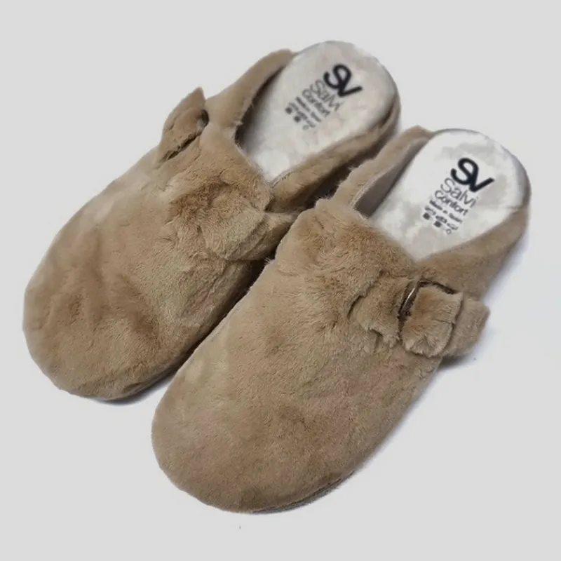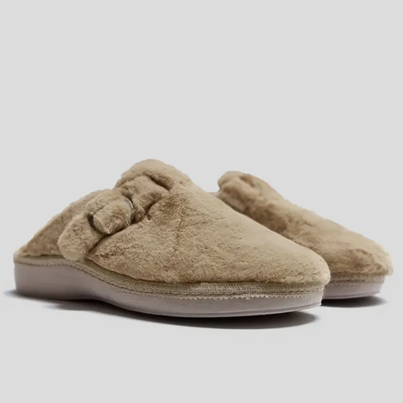 Zapatilla Abierta de casa URSUS en PELUCHE color CAMEL con hebilla lateral. Forro interior y plantilla aterciopelados. Lleva una plantilla interior acolchada de CUÑA EXTRAÍBLE. Suela de goma flexible y antideslizante. Zapatilla superligera y cómoda.