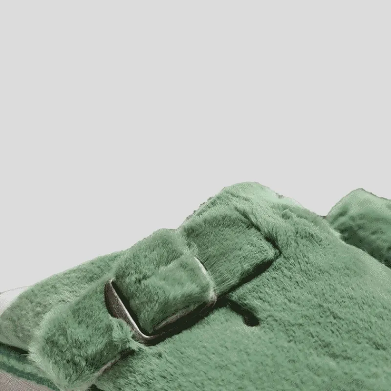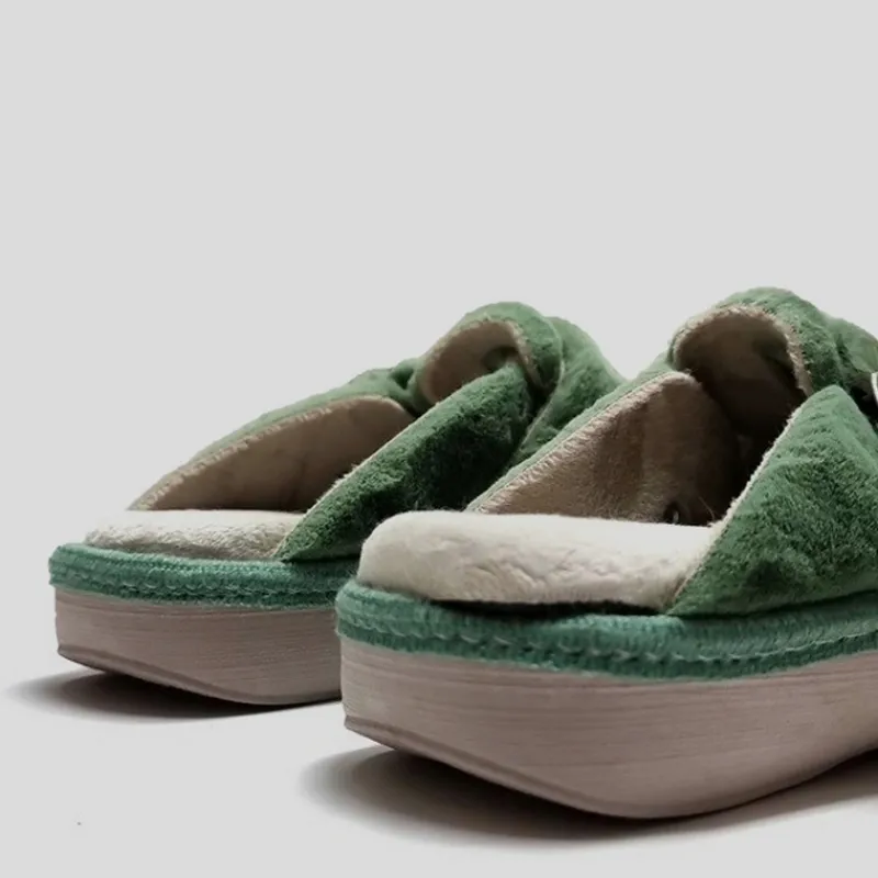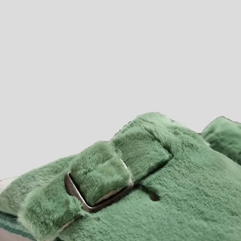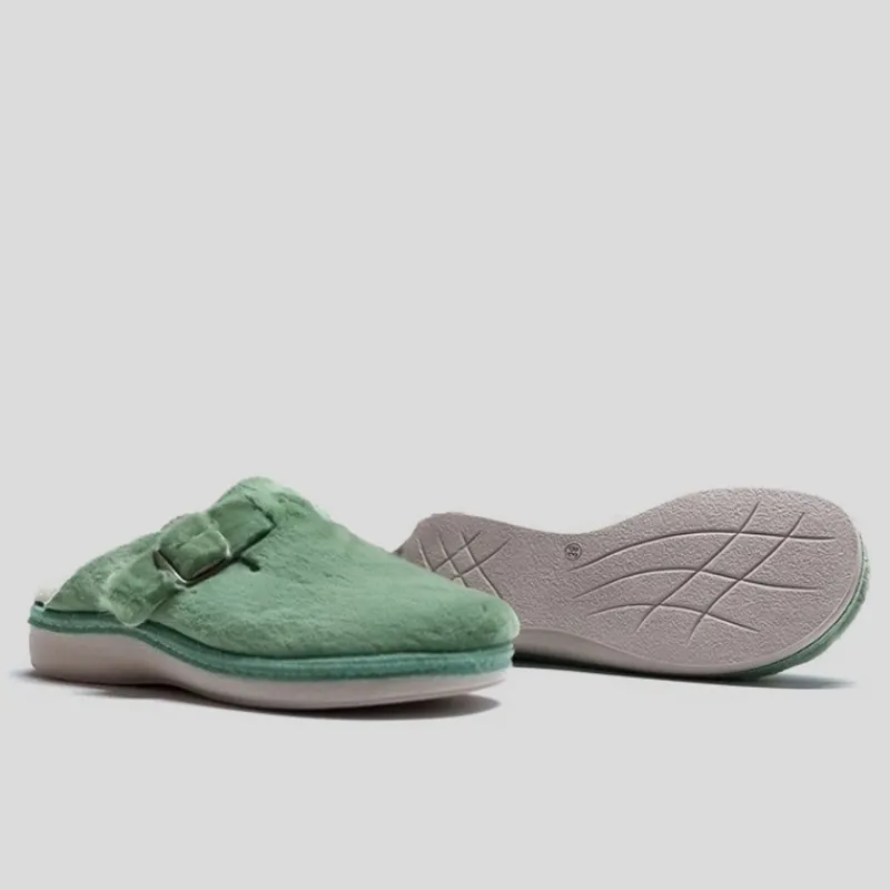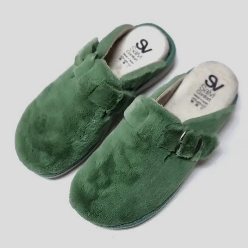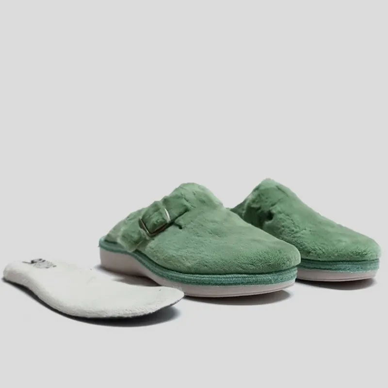 Zapatilla Abierta de casa URSUS en PELUCHE color VERDE JADE con hebilla lateral. Forro interior y plantilla aterciopelados. Lleva una plantilla interior acolchada de CUÑA EXTRAÍBLE. Suela de goma flexible y antideslizante. Zapatilla superligera y cómoda.