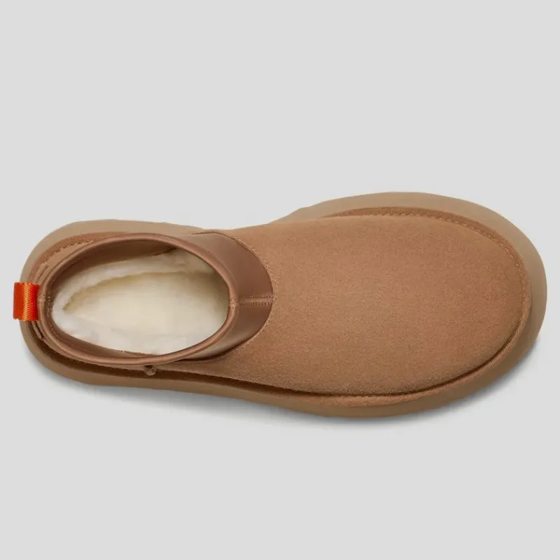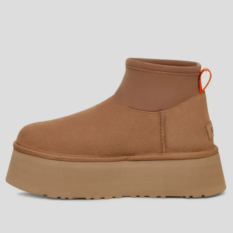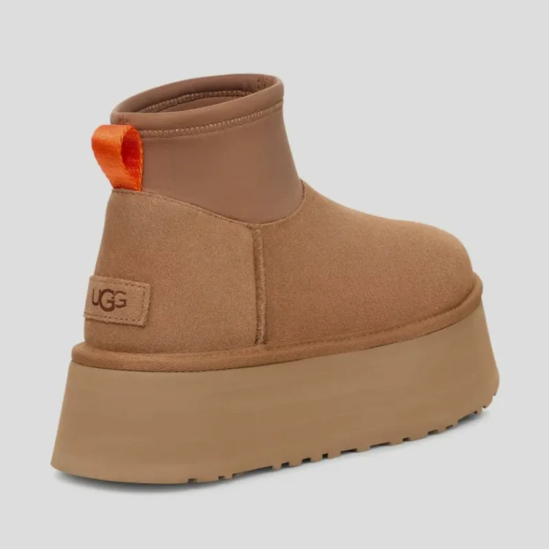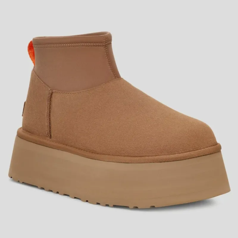 Botas de mujer UGG modelo Classic Mini Dipper confeccionadas en ante color CAMEL con la caña en NEOPRENO. Forro de UGGplush reciclado y suela de EVA ligera con PLATAFORMA de 5 cm. Trabilla trasera en poliéster naranja.