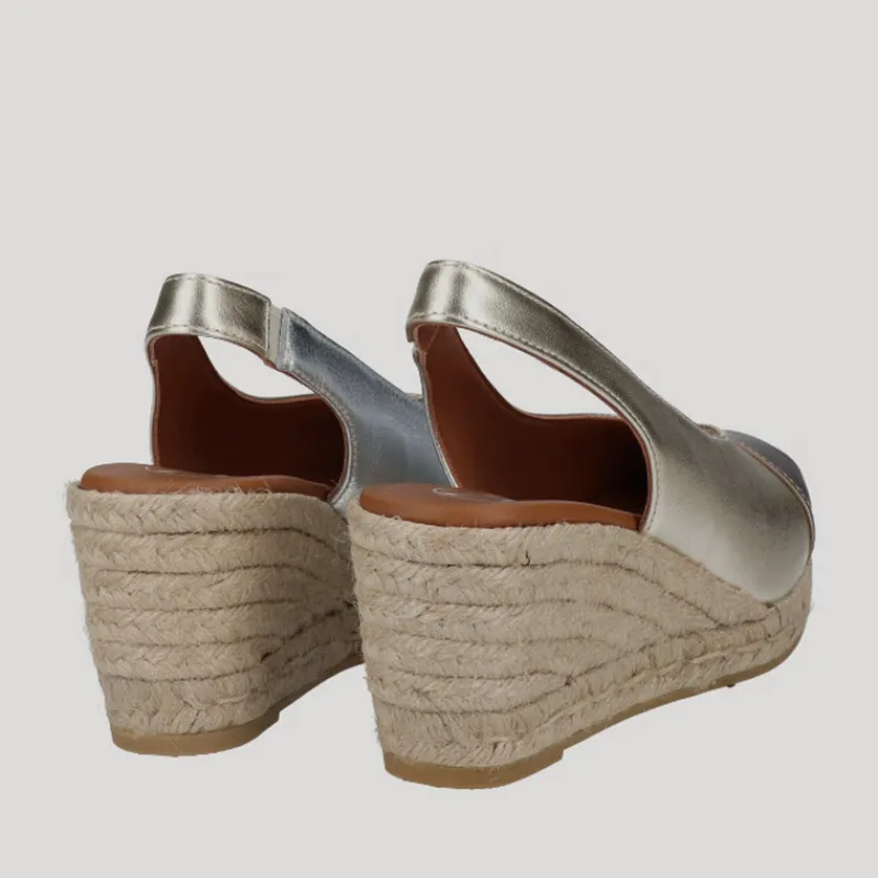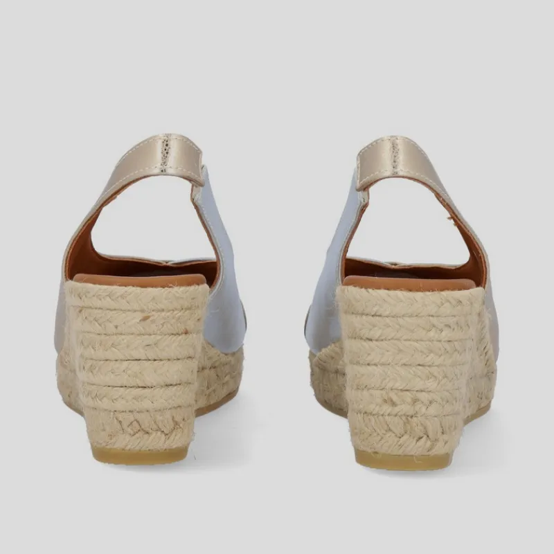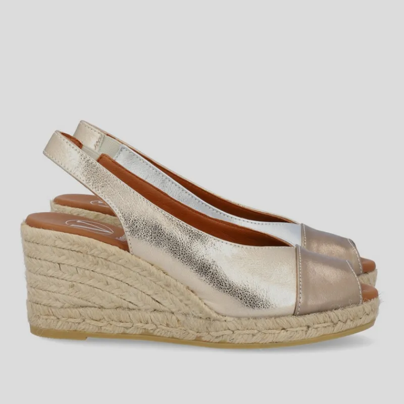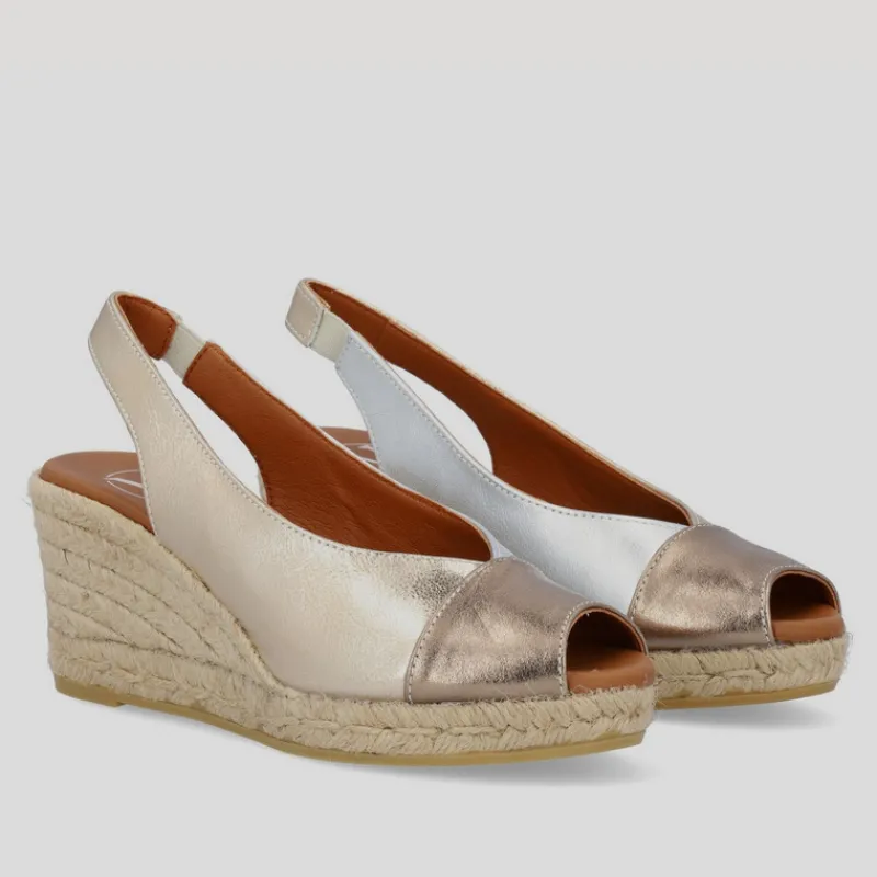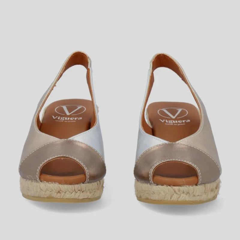 Alpargata Cuña Alta estilo PEEP TOE de VIGUERA en piel metalizada PLATA, PLATINO y ORO combinada en tres zonas: lateral izquierdo, lateral derecho y puntera. Puntera abierta y tira de talón con elástico. Suela de yute con goma. Plantilla de piel acolchada
