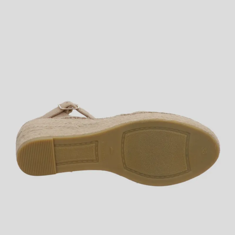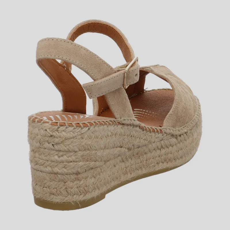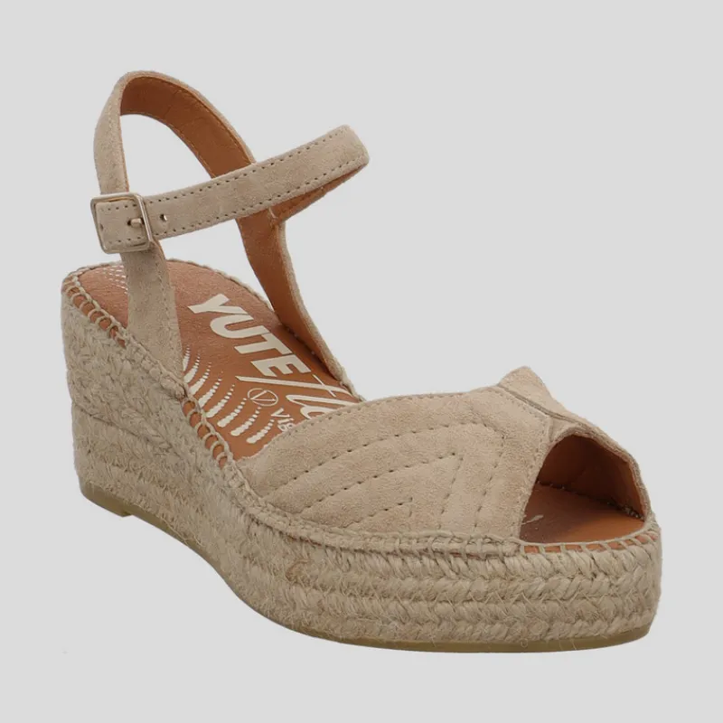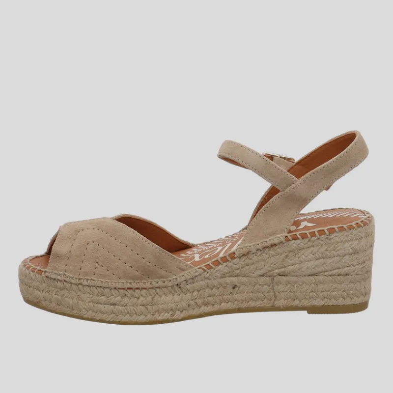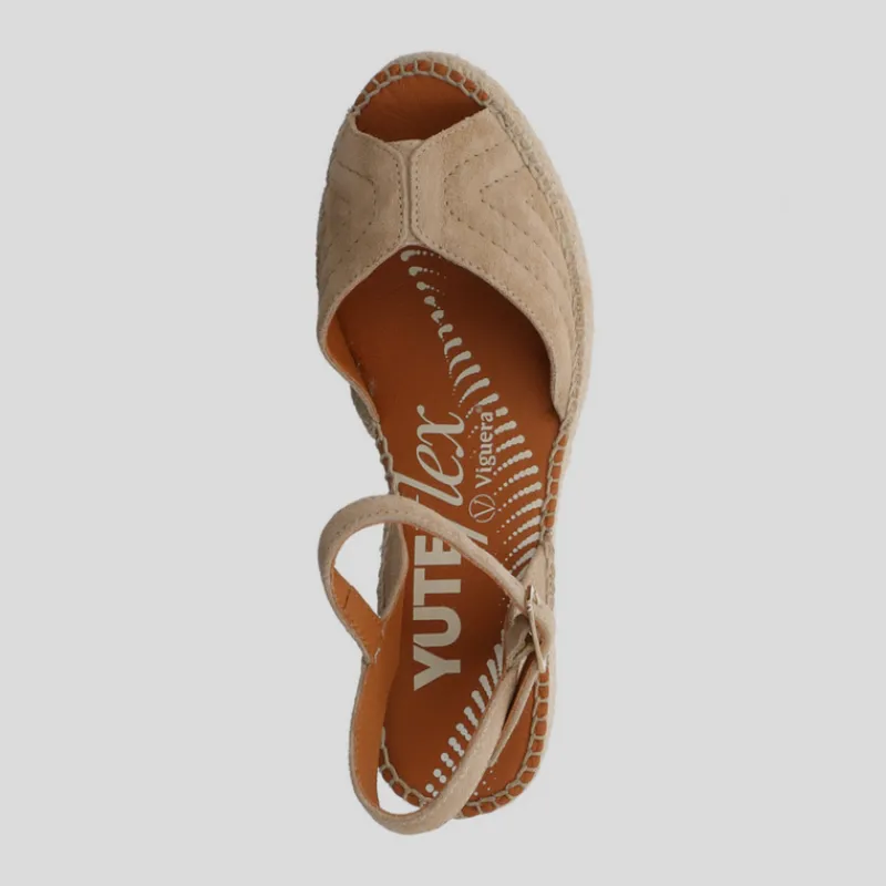 Alpargata YUTE FLEX con Cuña Media de VIGUERA en ante color BEIGE ARENA decorado con pespuntes efecto chevron. Diseño de puntera abierta y escote en pico con tira de talon en «Y» de ajuste por hebilla. Plantilla de piel acolchada. Suela de yute con goma.