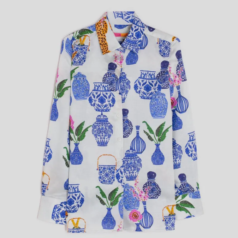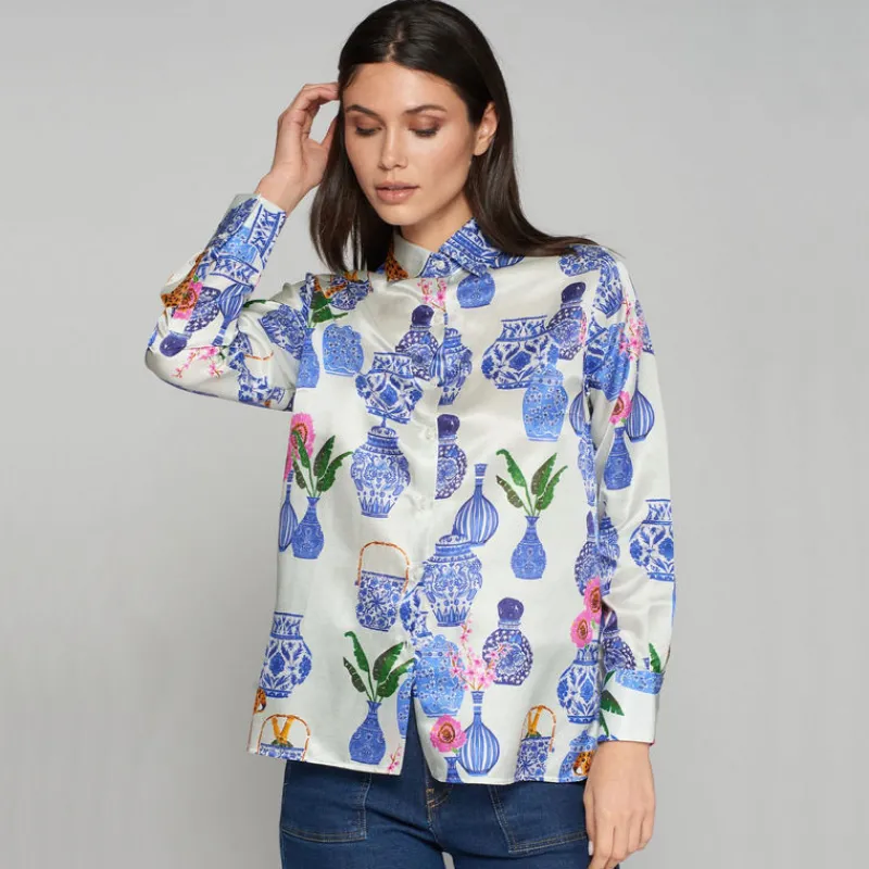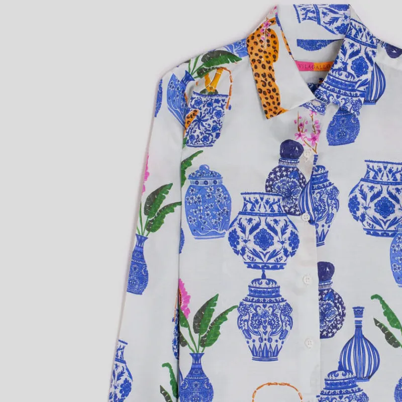 Camisa de VILAGALLO modelo MARIELA confeccionada en tejido de seda algodón CRUDO con estampado combinación PORCELANA AZUL y GUEPARDO. Ilustración en exclusiva para Vilagallo. Cierre frontal con botones. Manga larga acabada en puño. Bajo con corte lateral.