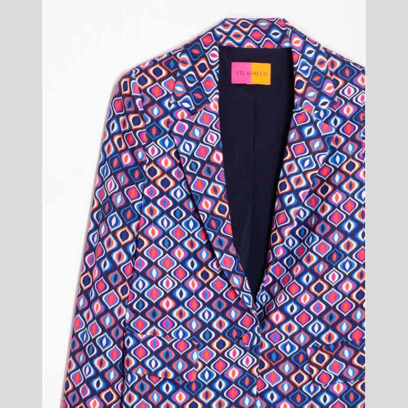 Chaqueta de punto elástico VILAGALLO modelo MONZA confeccionado en VISCOSA ELÁSTICA con estampado estilo Missoni MULTICOLOR. Lleva cuello tipo sastre y cierre por botón al centro.