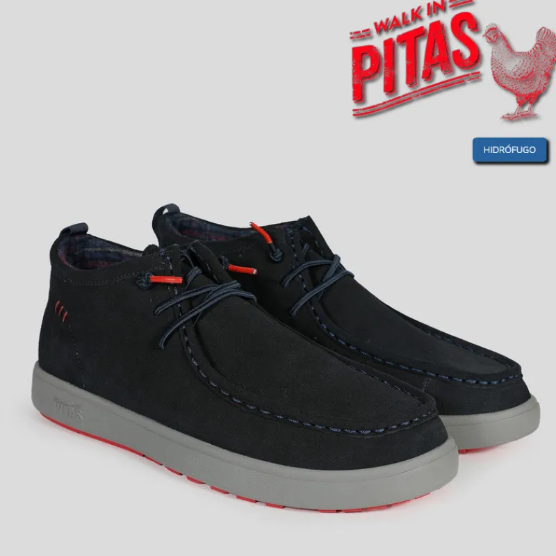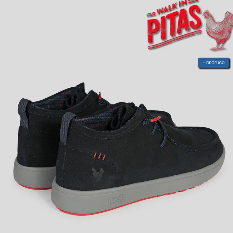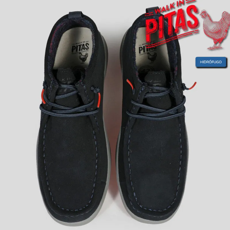 Wallabi de Hombre WALK IN PITAS modelo TUG color AZUL MARINO en ante hidrofugado repelente al agua. Forro textil térmico. Plantilla EVA PITAS-COMFORT CUÑA con planta de piel. Suela EVA ultralight con goma ANTIDESLIZANTE. Cordones elásticos.