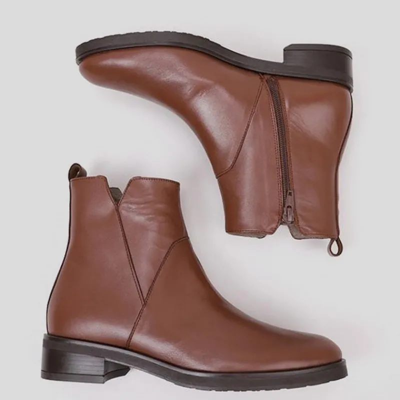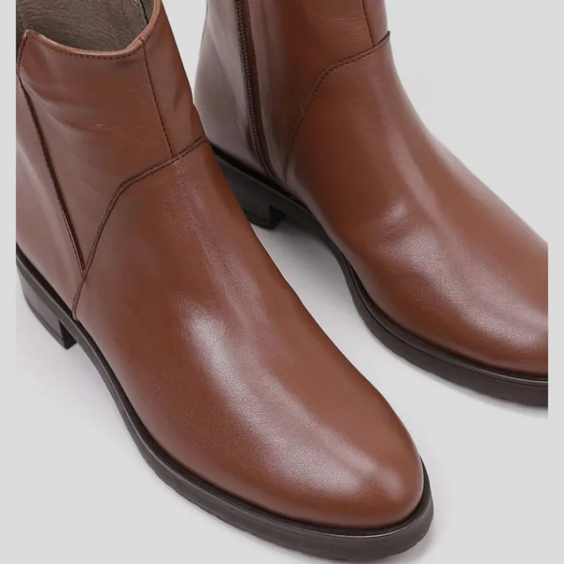 Botín PLANO de WONDERS en piel lisa color MARRÓN. Diseño clásico con corte cut out lateral y cierre por cremallera lateral con tirador trasero para un mejor calce. Plantilla de piel acolchada. Puntera redonda y suela de goma flexible.