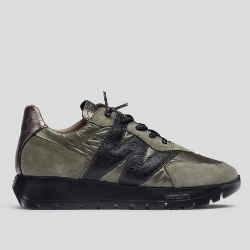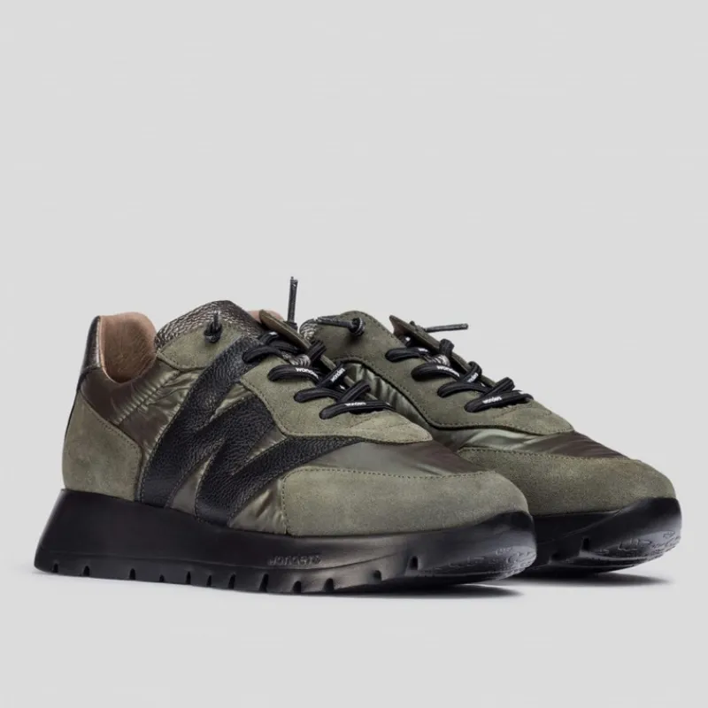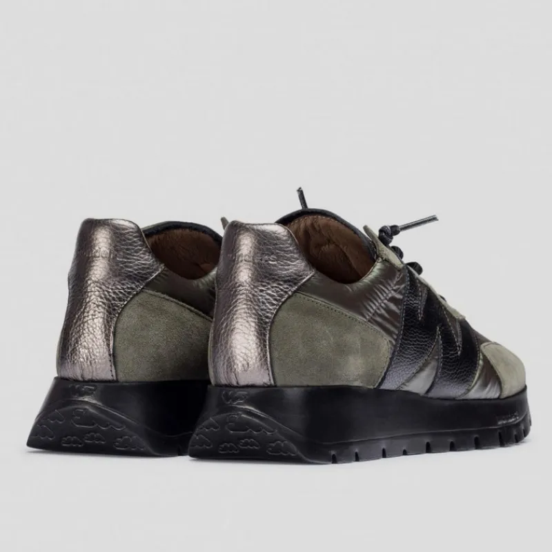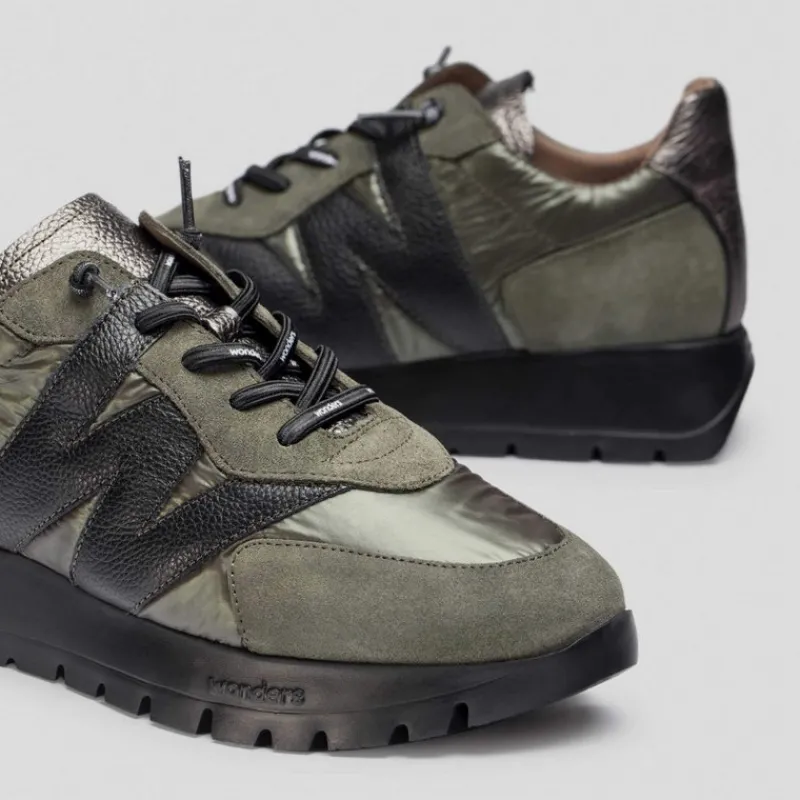 Deportiva WONDERS combinada en ante y nylon VERDE con piel PLOMO y NEGRO. Modelo urban con detalle de logo lateral y cierre con cordones elásticos brandeados. Plantilla interna extraible MemoryGel que amotigua tu pisada. Suela desarrollada con WondersFly.