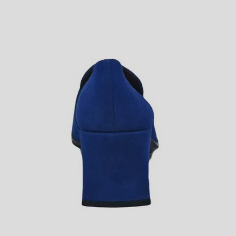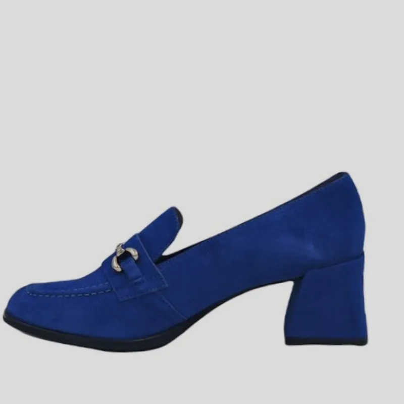 Mocasín CELIA de WONDERS en ante AZUL COBALTO. Modelo clásico con detalle de trabilla metalizada en el antifaz, punta y tacón cuadrado forrado en ante al tono. Plantilla MemoryGel amortiguada y que se adapta a la pisada. Suela de tpu flexible.