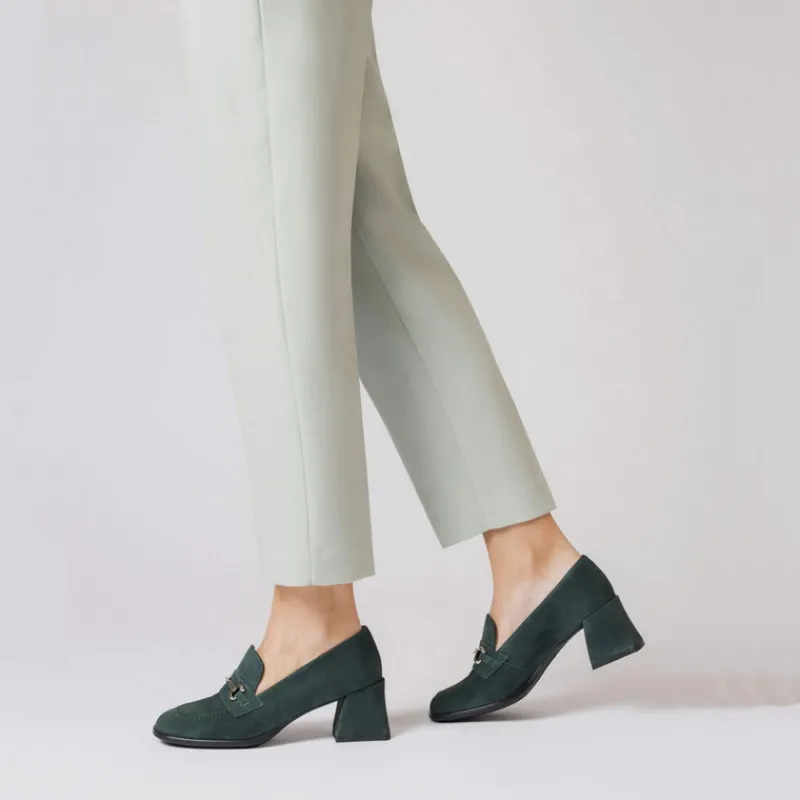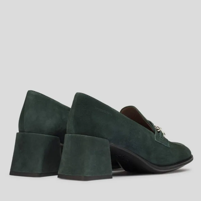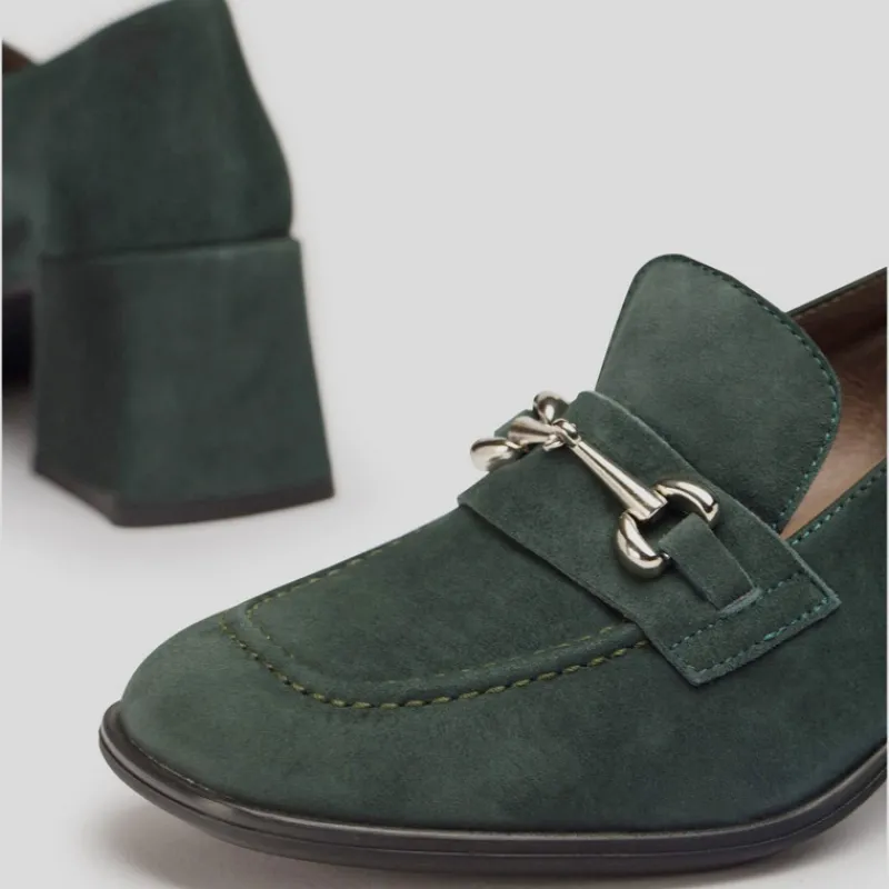 Mocasín CELIA de WONDERS en ante VERDE BOTELLA. Modelo clásico con detalle de trabilla metalizada en el antifaz, punta y tacón cuadrado forrado en ante al tono. Plantilla MemoryGel amortiguada y que se adapta a la pisada. Suela de tpu flexible.