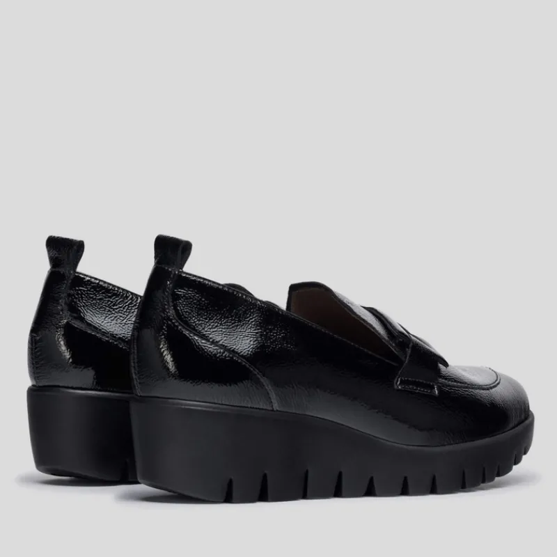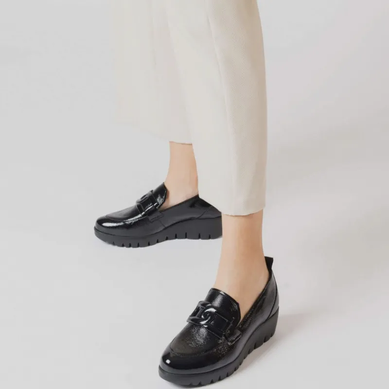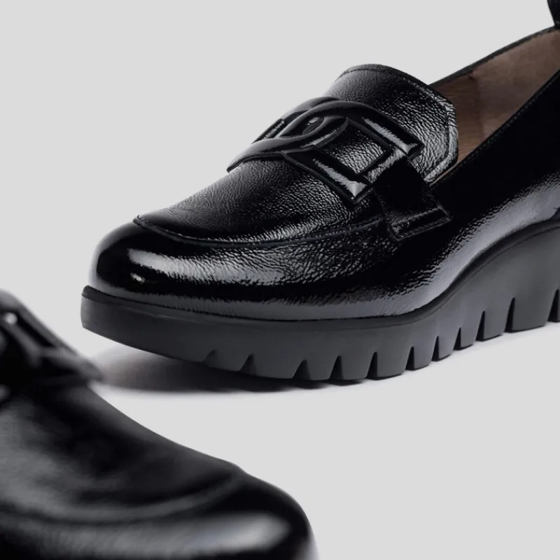 Mocasín RINGS con cuña de WONDERS en piel charol NEGRO con detalle de hebilla en charol al tono. Plantilla de piel acolchada. Suela maxi desarrollada con tecnología WondersFly ™ garantía de ligereza y confort . Prepárate para la sensación, YES WE FLY.