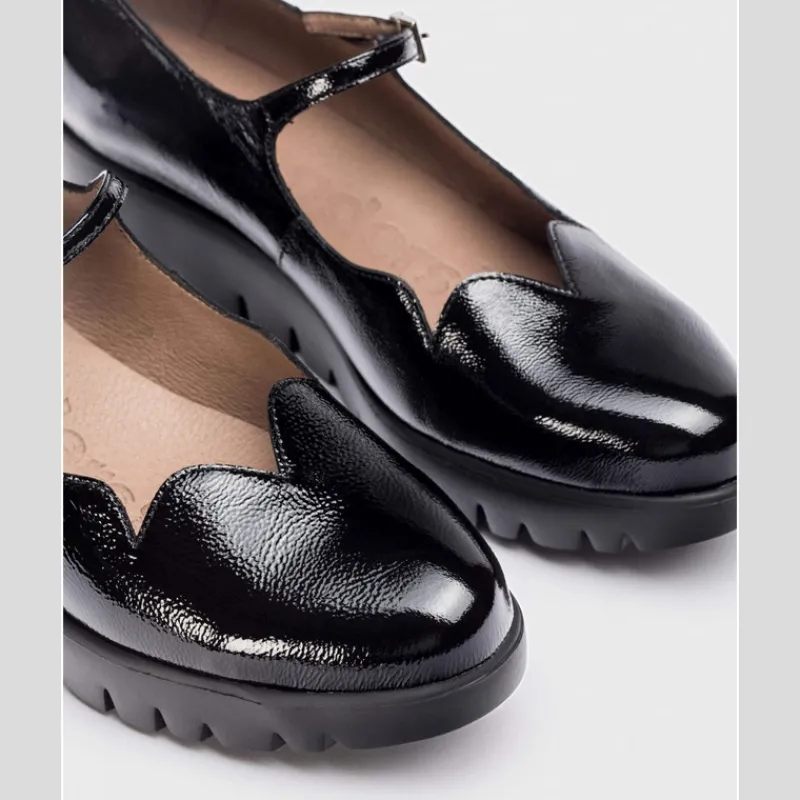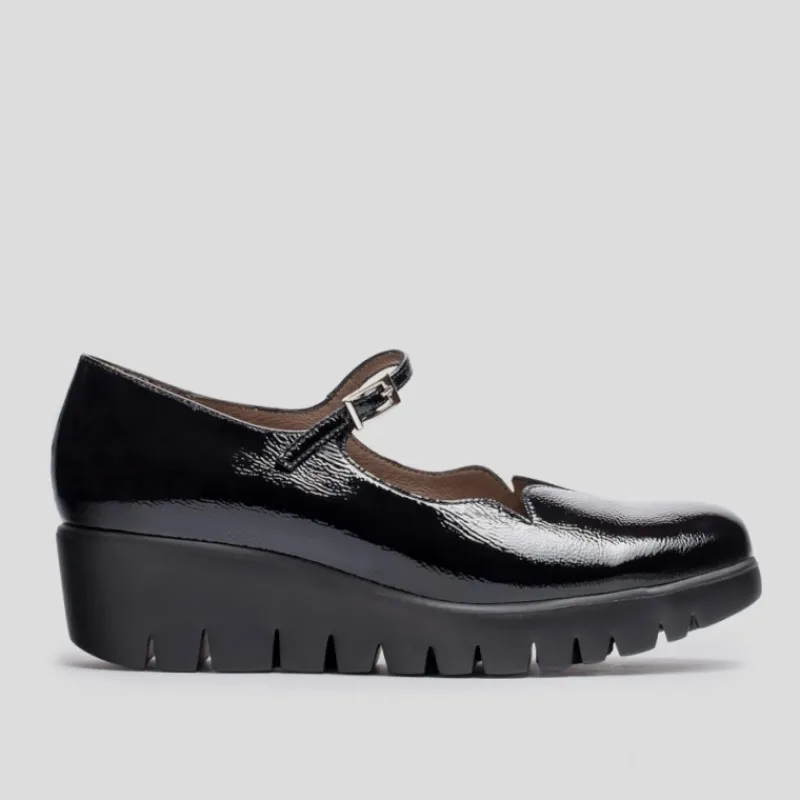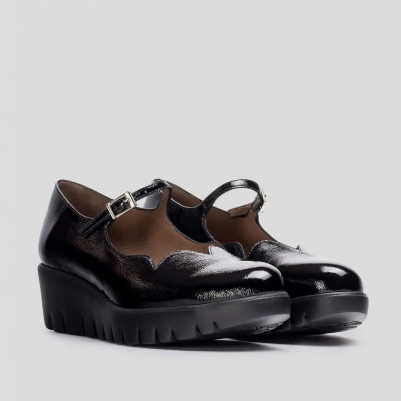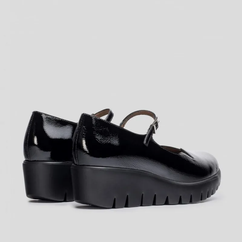 Merceditas SEVILLA con cuña de WONDERS en piel charol NEGRO con ajuste por hebilla y detalle de ondas en el corte delantero. Suela maxi desarrollada con tecnología WondersFly ™ garantía de ligereza y confort . Prepárate para la sensación, YES WE FLY.